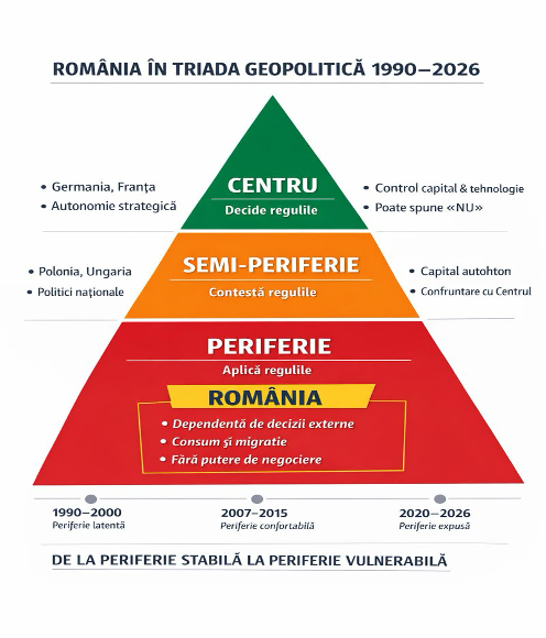 România nu a fost niciodată în centru. Dar, spre deosebire de alte state est-europene, a ratat constant tranziția spre semi-periferie. În timp ce Polonia, Ungaria sau Cehia au acceptat integrarea ca punct de plecare, România a transformat-o într-un plafon.